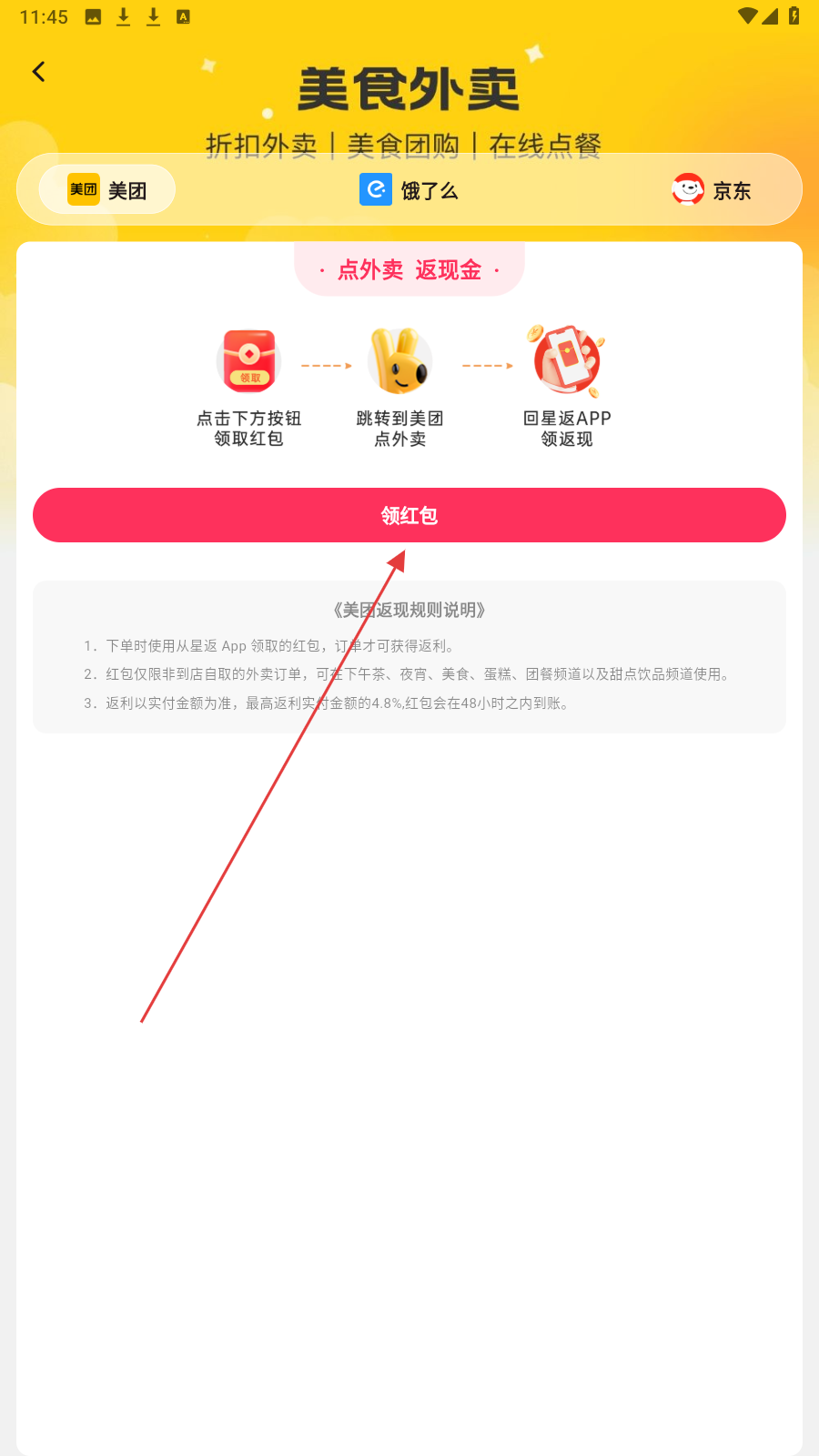 4、在美食外卖页面,点击【领红包】,领取红包后跳转到美团点外卖。