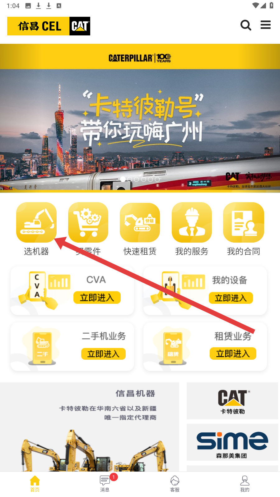 1、点击首页【选机器】,进入卡特挖掘机列表页面。