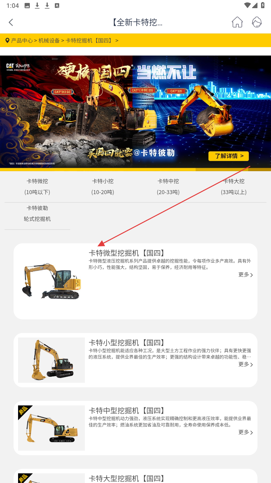 2、在挖掘机列表页,点击【卡特微型挖掘机【国四】】,进入微型挖掘机列表页。