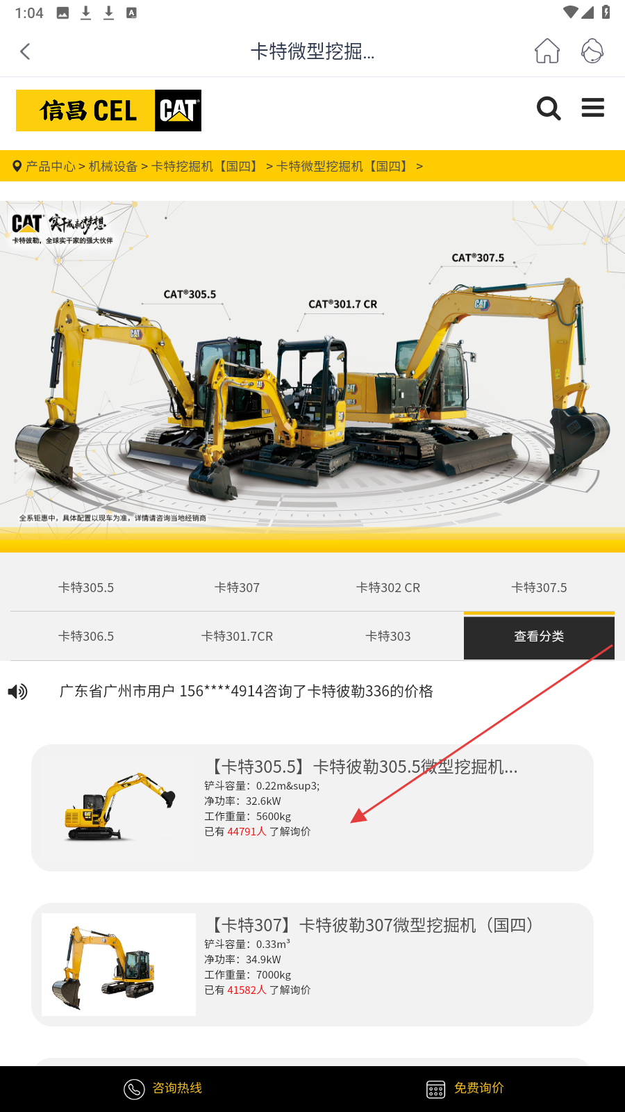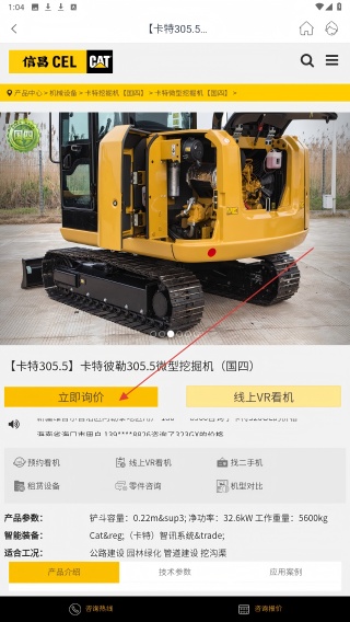 3、在微型挖掘机列表页,找到心仪型号如【卡特305.5】并点击。