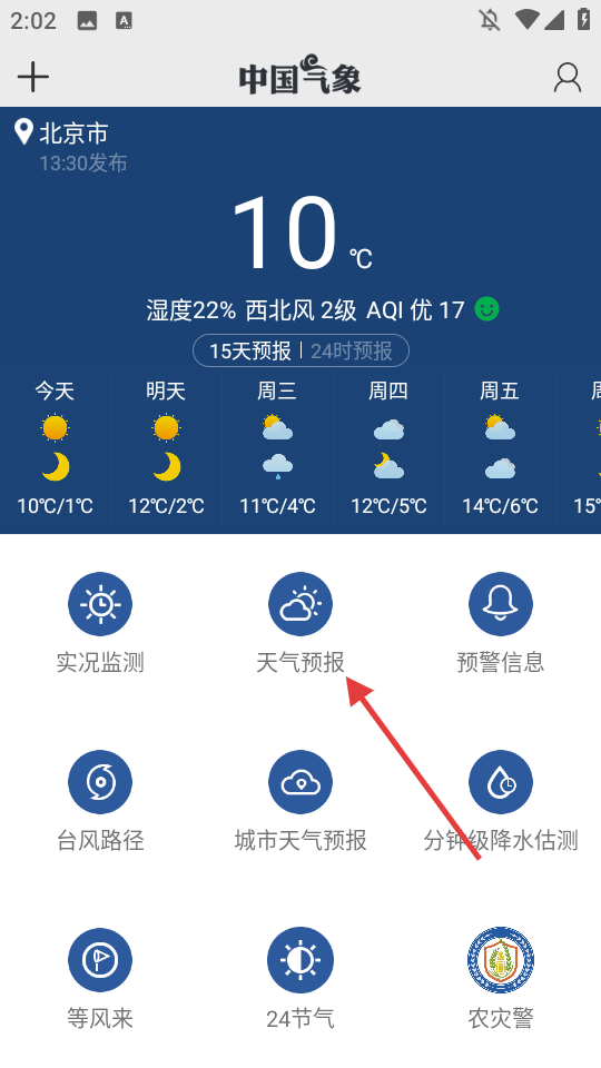 1、打开APP,点击【天气预报】功能入口。