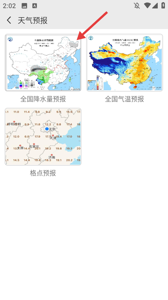 2、在天气预报界面选择【全国降水量预报】。