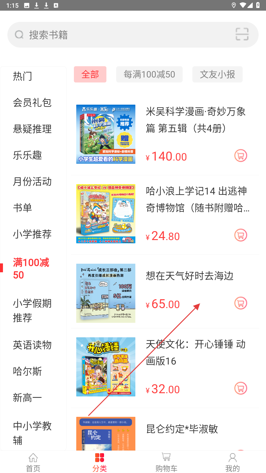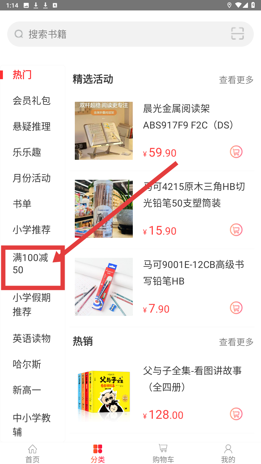 2、在分类页,点击【满100减50】分类,浏览对应商品列表。