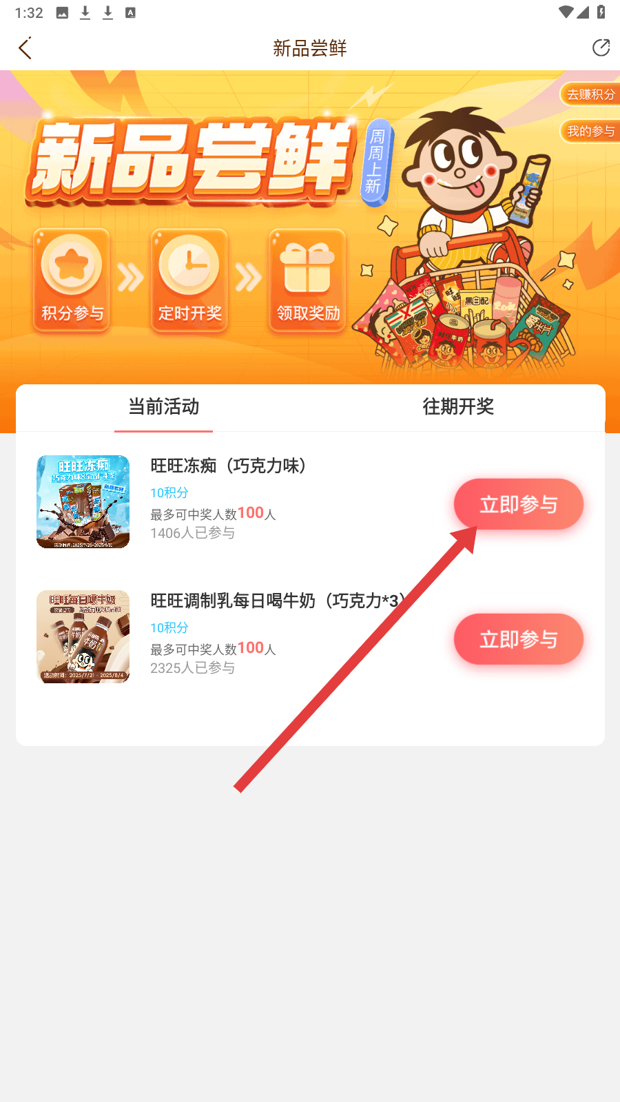 2、在活动页,点击心仪商品如【旺旺冻痴巧克力味】的【立即参与】。