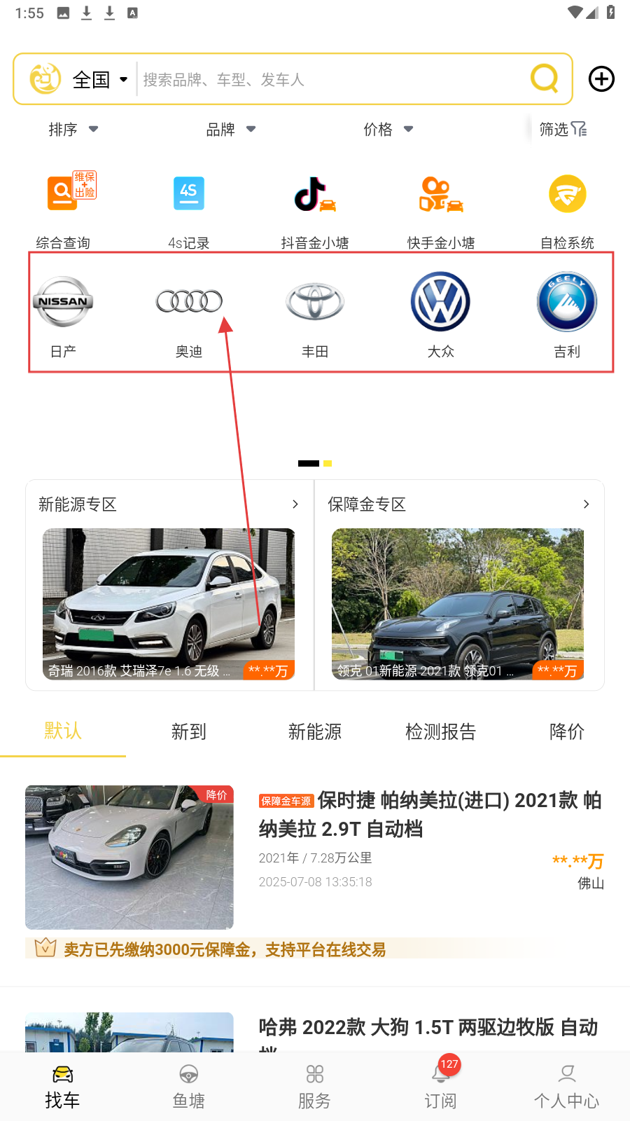 1、在首页品牌区,点击心仪品牌如【奥迪】,进入品牌车型列表。