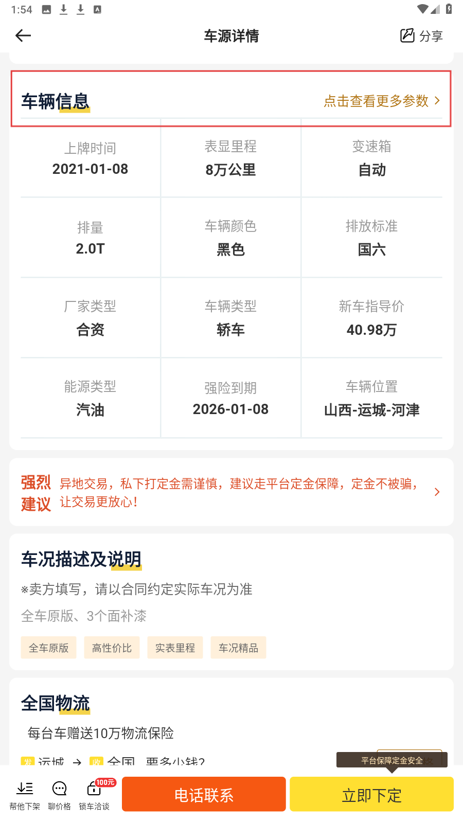 3、在车源详情页,点击【点击查看更多参数】,查看车辆详细信息。