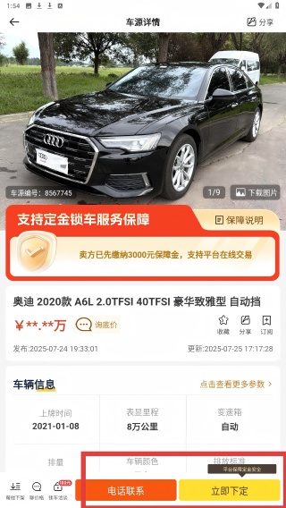 2、在品牌列表页,点击心仪车型如【奥迪2020款A6L】,进入车源详情页。
