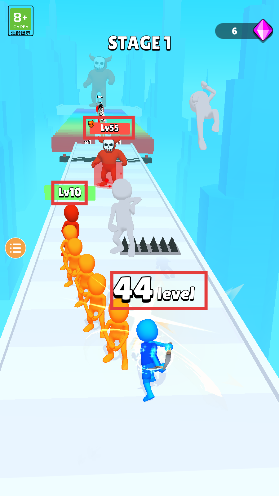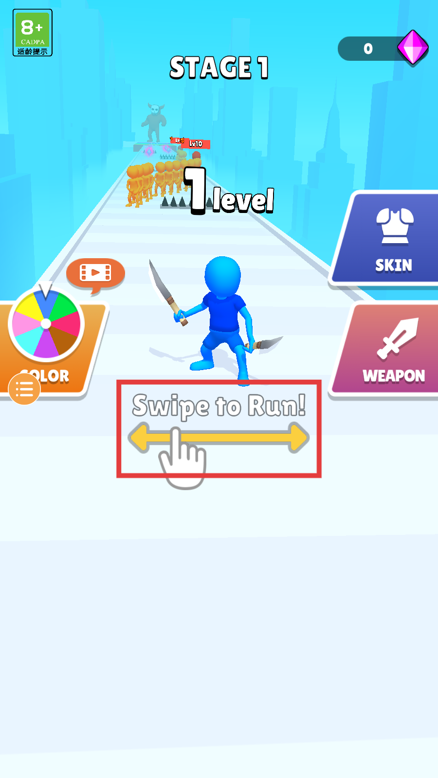 1、在【STAGE-1】起始界面,按【Swipe-to-Run!】提示滑动屏幕,操控蓝色角色持武器开启跑酷战斗之旅。