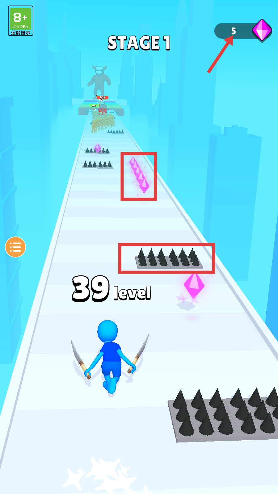 2、跑酷时避开【尖刺】障碍,优先拾取【紫色钻石】,积累资源同时注意右上角钻石数量变化。