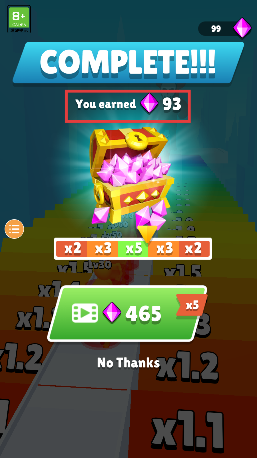 4、通关【STAGE-1】后领取【93】钻石奖励,可选择看广告翻倍或直接点【No-Thanks】继续下一关。