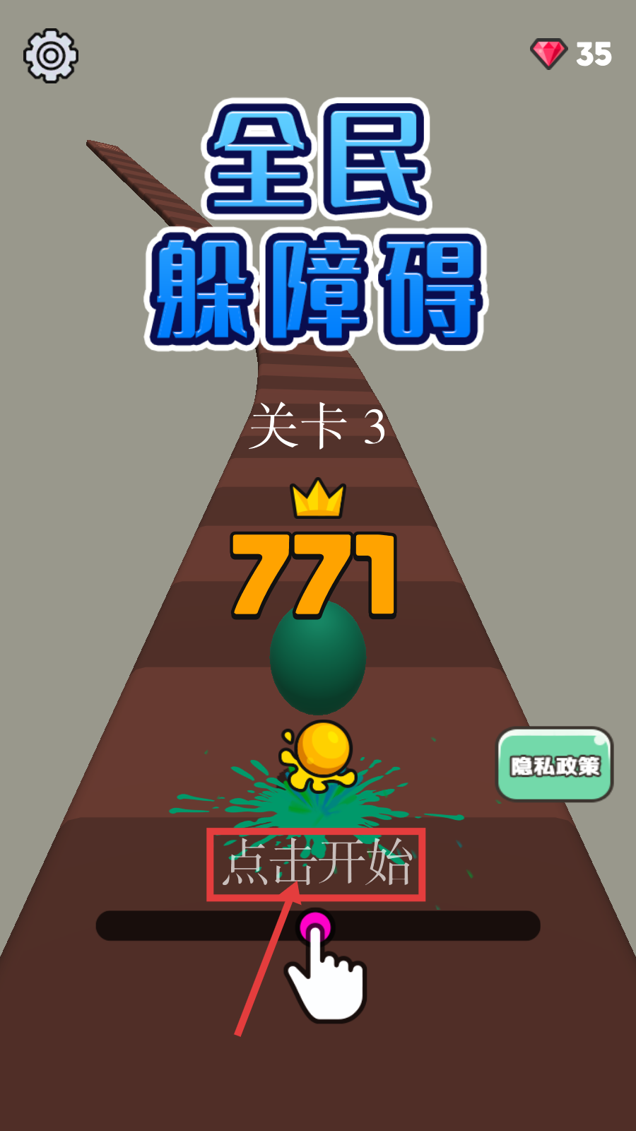 1、在《全民躲障碍-关卡3》界面,点击【点击开始】按钮,操控球体开启关卡,初始分数771,注意路径障碍。
