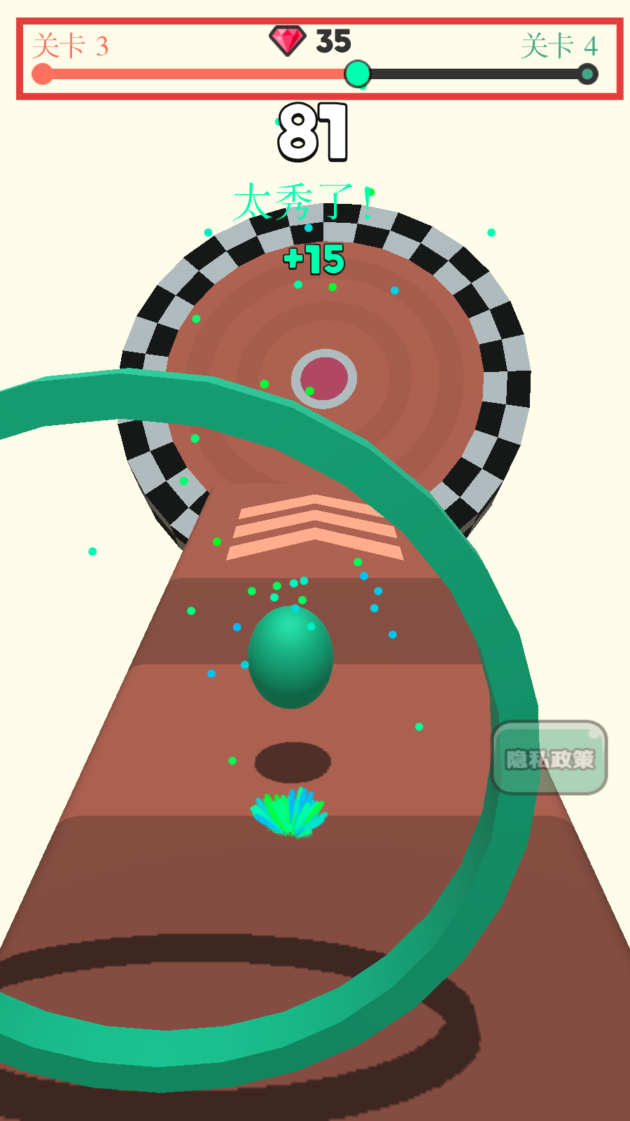 3、通过绿色环形轨道时,保持球体稳定,抵达黑白格终点区域,此时得分81并获【+15】,继续向终点推进。
