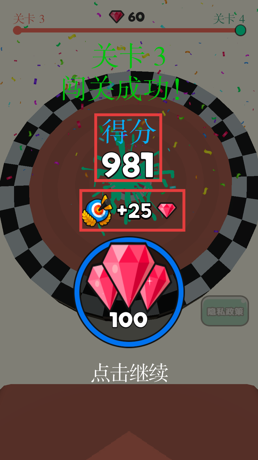4、关卡3闯关成功,得分981并获【+25】钻石,总钻石达60,点击【点击继续】,准备挑战后续关卡。
