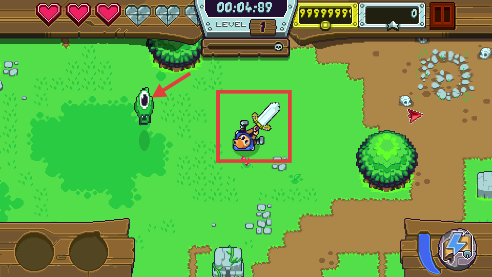 3、进入关卡,操控骑士移动,靠近绿色怪物(独眼怪)战斗。