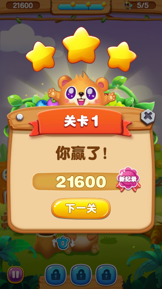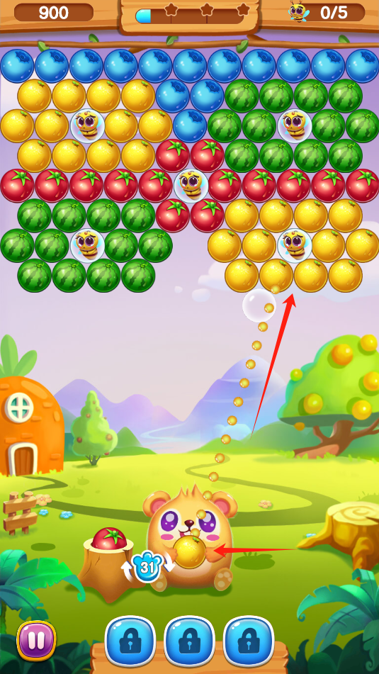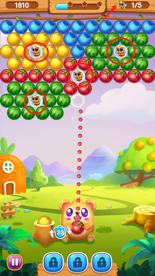 2、关卡目标是救下5只小蜜蜂,射击水果即可救下蜜蜂。