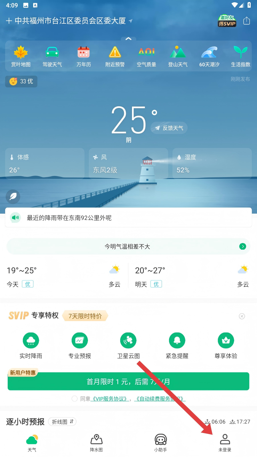 1、打开彩云天气,点击右下角【未登录】,进入个人功能页面,这里可找到设置入口呢。