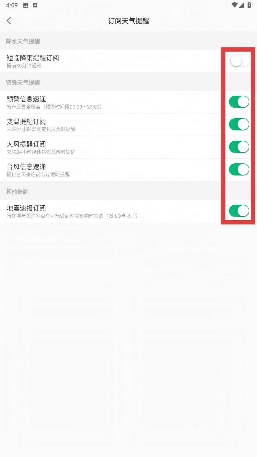 4、在订阅天气提醒页面,按需开启【短临降雨提醒订阅】等各类提醒开关,就能及时收到天气提醒啦。
