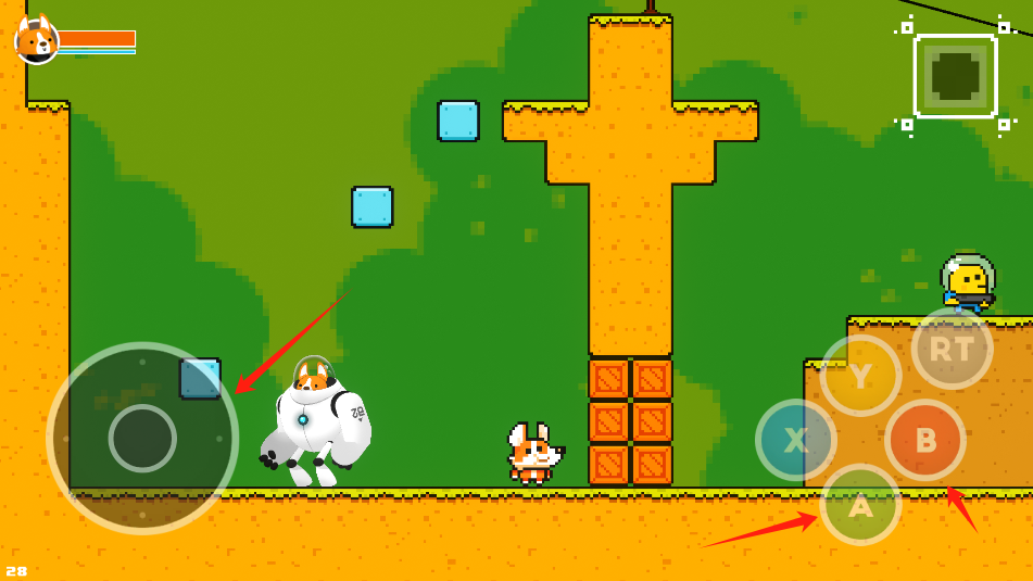 3、融入动物拟人化设定,柯基主角可二段跳、用飞行背包与武器,操作丰富。