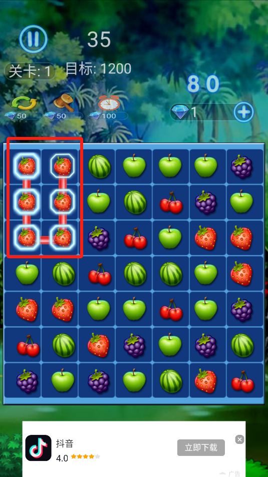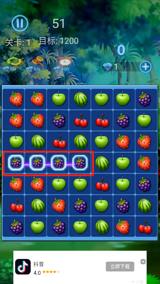2、点击滑动相连在一起的水果,至少两个以上的水果,需在60秒内,完成目标分数。