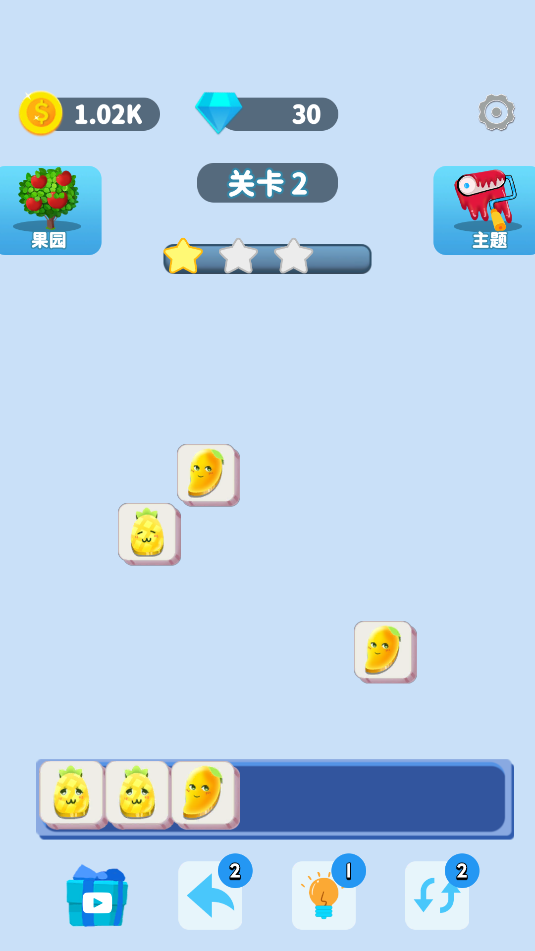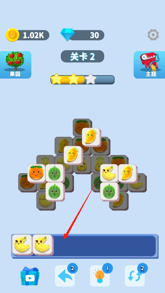 1、游戏中,点击三个相同的水果来进行消除任务。
