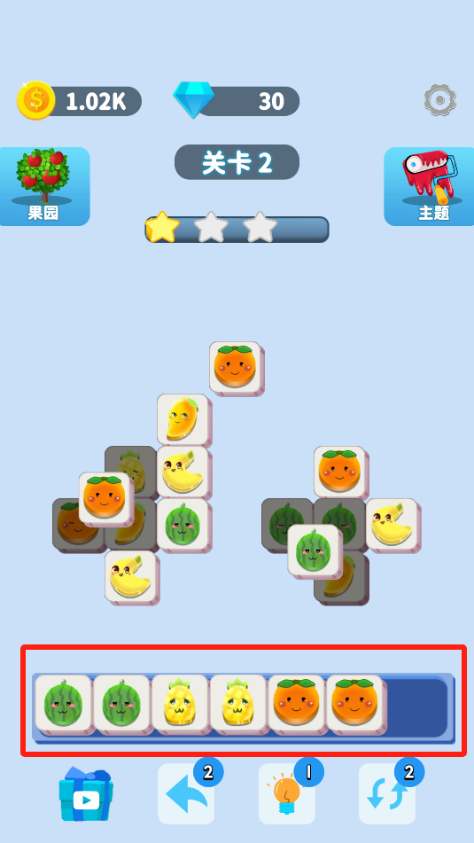 2、点击的水果会放置在下方的框架中,最多可存放6个不能消除的水果。