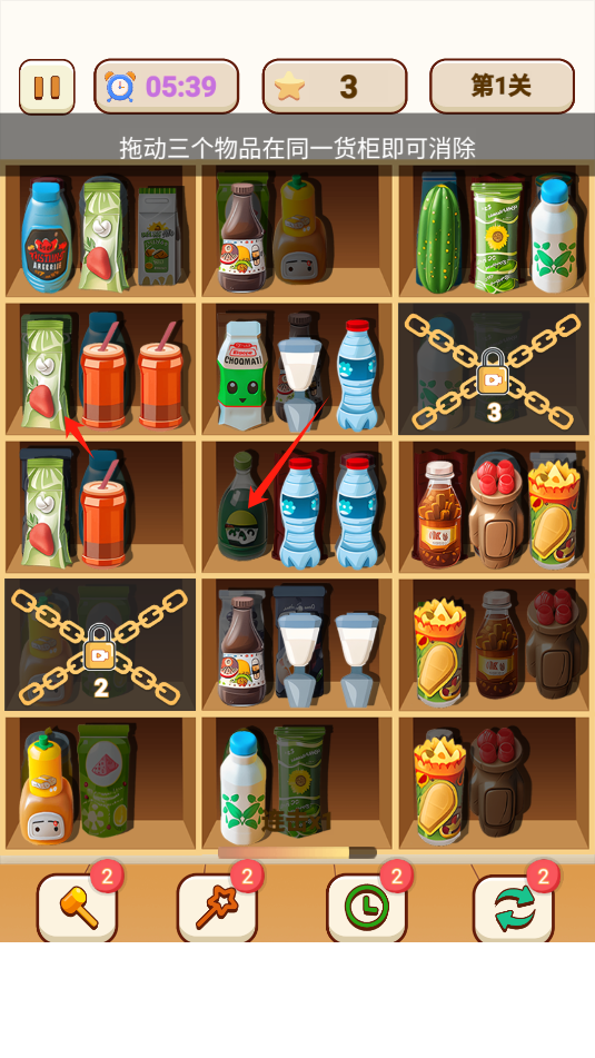 1、操作简单易上手,融合三消匹配与收纳整理,将相同物品放同一货架即可消除。