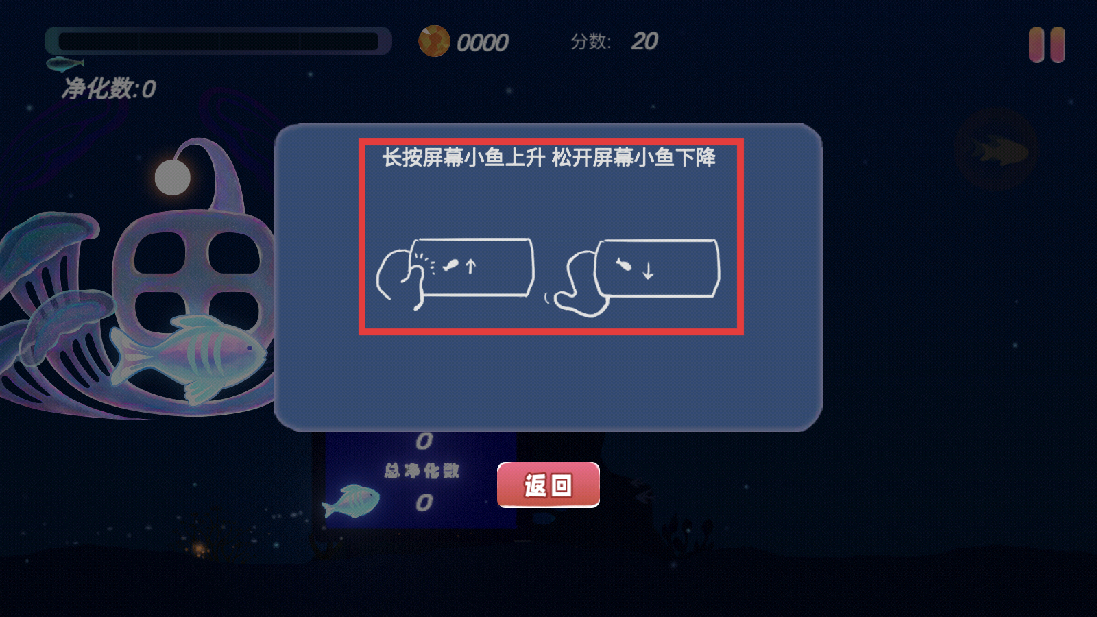 1、基本控制操作:点击屏幕控制小鱼上下游动,躲避障碍物净化更小的小鱼,获取宝石和金币坚持更远距离。