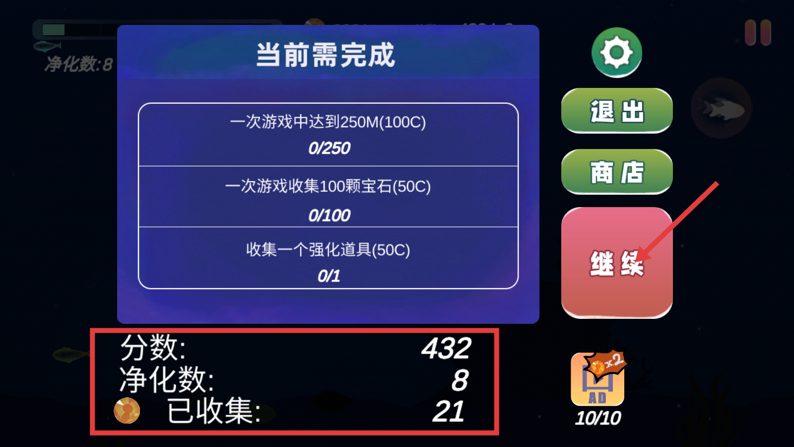 4、关注当前需完成的任务,比如达到250M、收集宝石等,同时留意分数、净化数和已收集数量,完成后点击【继续】。