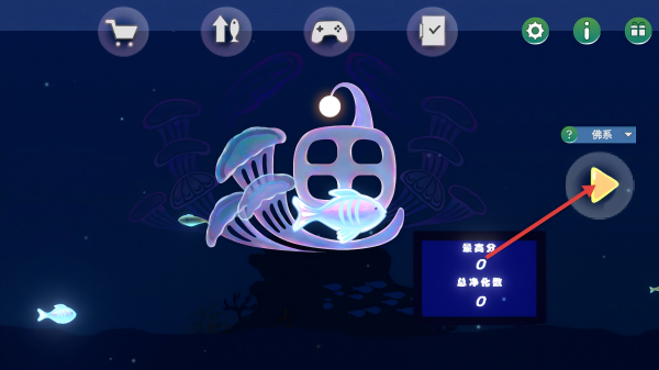 1、进入游戏界面,看到最高分和总净化数均为0时,点击【黄色-三角形-开始】按钮,开启游戏。