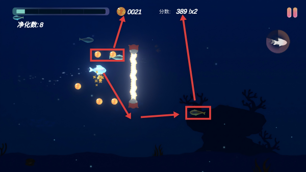 3、挑战中操控小鱼,收集场景里的金币,攻击其他小鱼,这样能提升分数,还可增加净化数,获取倍数奖励。