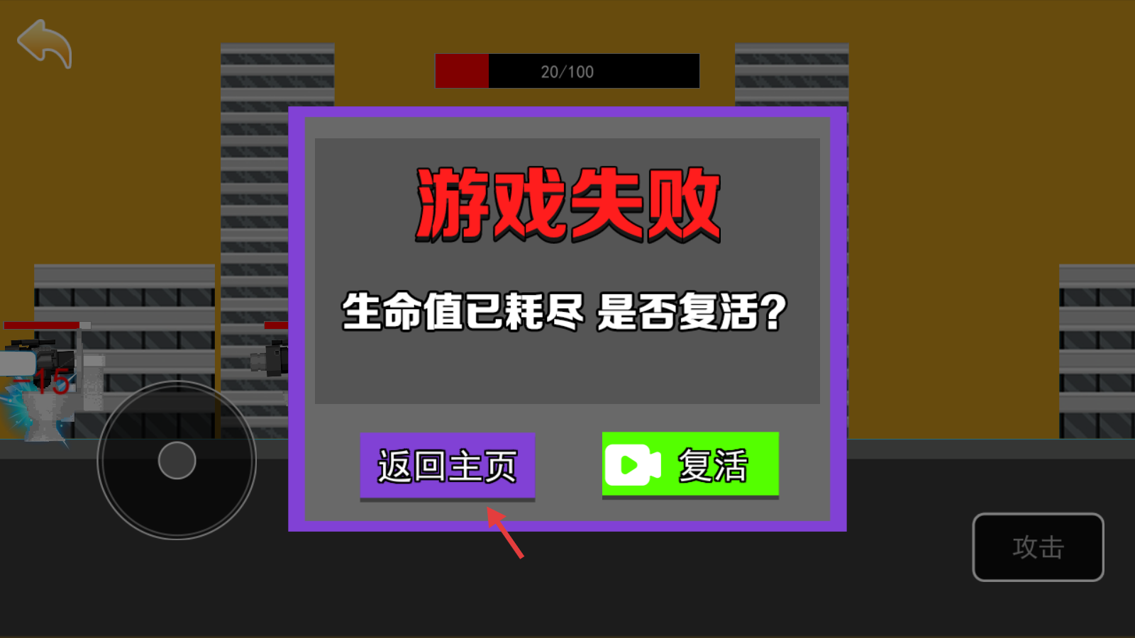 4、若生命值耗尽游戏失败,我们可以点击【返回主页】重新开始,准备再次挑战生存冒险呀。