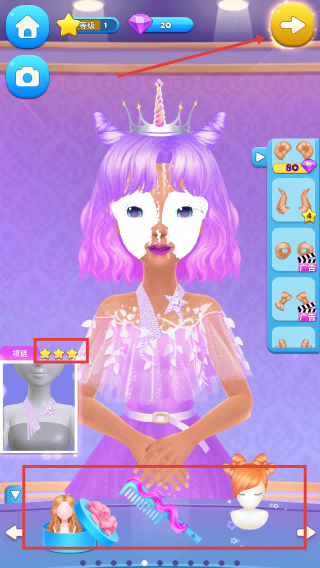 3、搭配好独角兽皇冠等头饰后,点击右上角黄色箭头,完成当前装扮步骤。