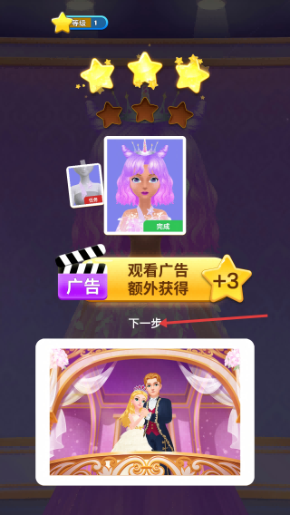4、装扮结束后,点击“下一步”,可选择观看广告额外获取星星,推进游戏流程。
