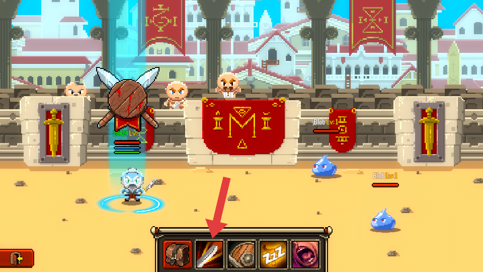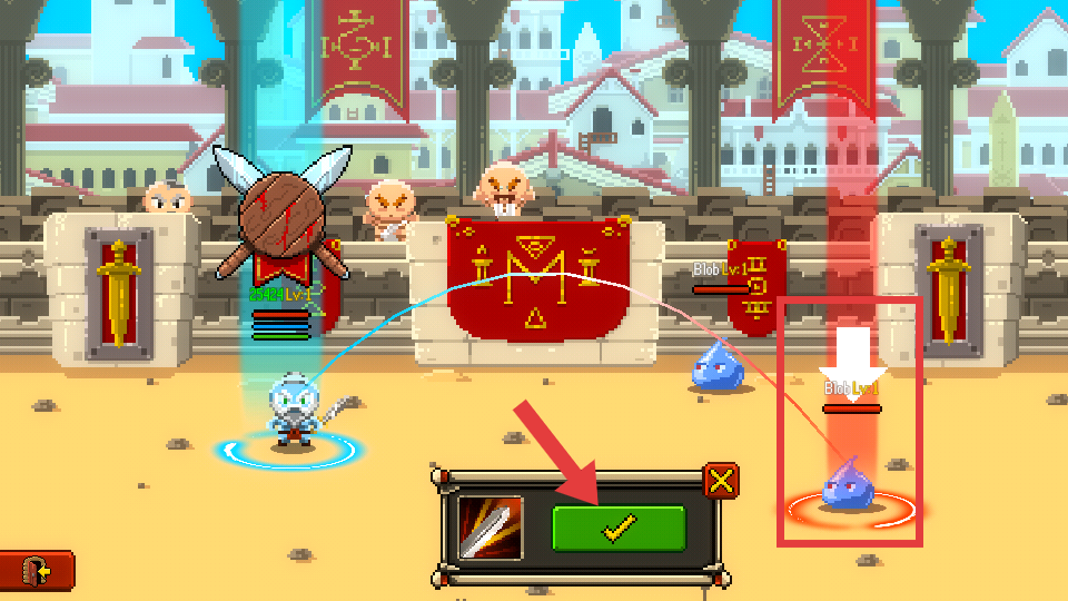 3、选择好敌人(如蓝色史莱姆Blob)后,再次点击武器图标并确认,攻击红框内的敌人。