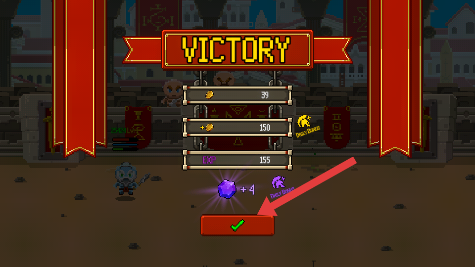 4、成功击败敌人取得胜利后,查看获得的金币、经验等奖励,点击下方箭头所指的确认按钮,继续后续游戏内容。