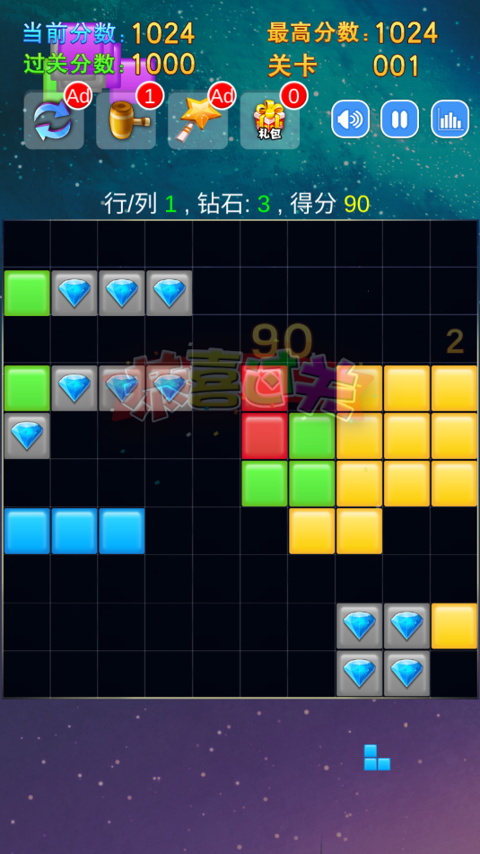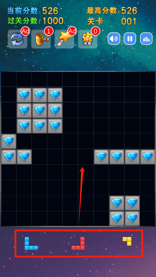 2、游戏是移动下方的三个不同方块,放置在上方的格子中,填满一行或一列来消除获得分数。