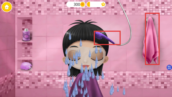 1、在粉色浴室场景中,使用紫色喷头为角色冲洗头发,完成洗发步骤。