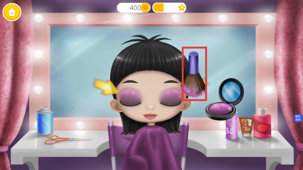 2、来到化妆镜前,用紫色刷子蘸取紫色眼影,为角色涂抹眼部妆容。