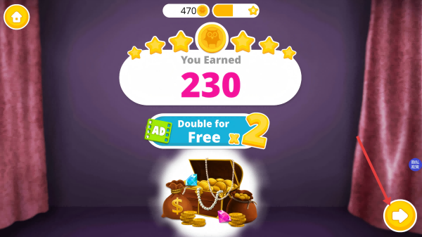 4、通关后,点击右下角黄色箭头按钮,领取230金币奖励并进入下一环节。