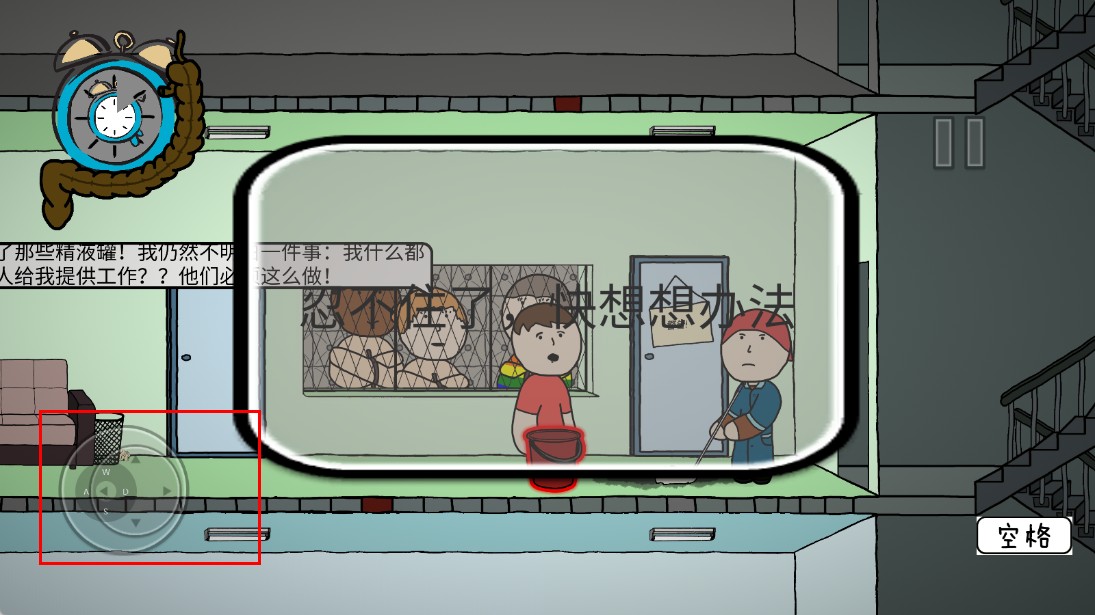 3、利用左下角虚拟按键操控角色移动,应对场景内的突发状况,比如角色“忍不住了”时,需快速行动。