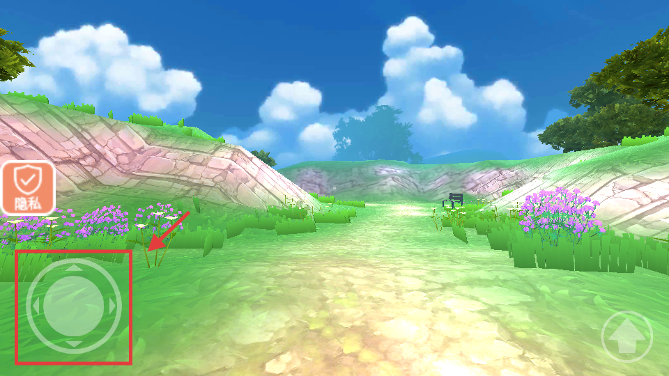 1、在户外草地场景中,通过左侧圆形操控盘移动角色。