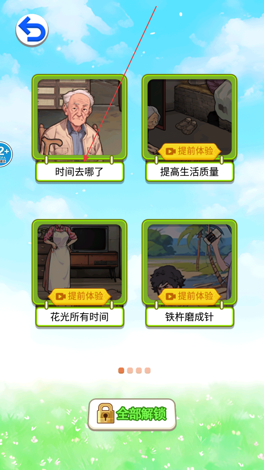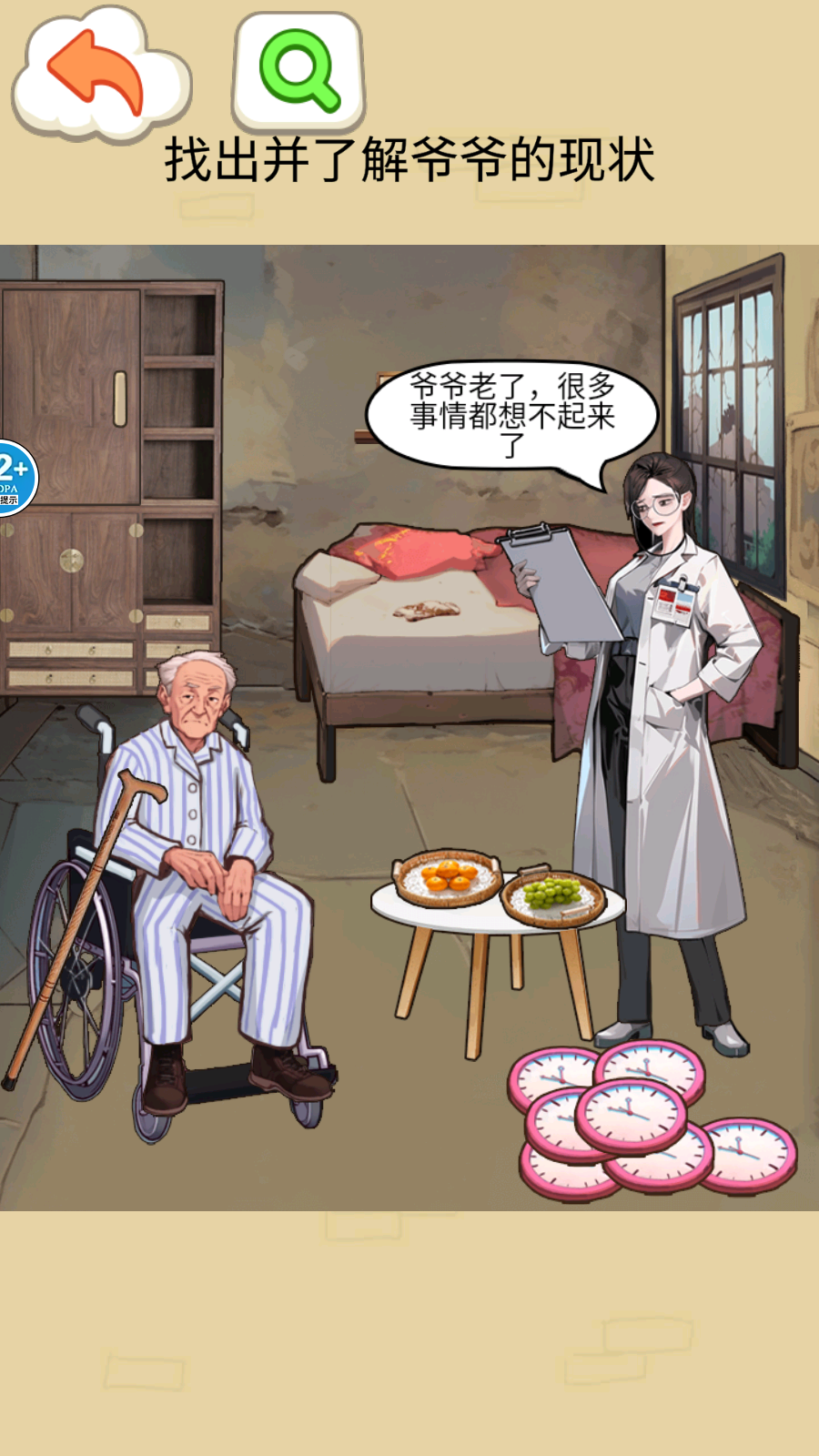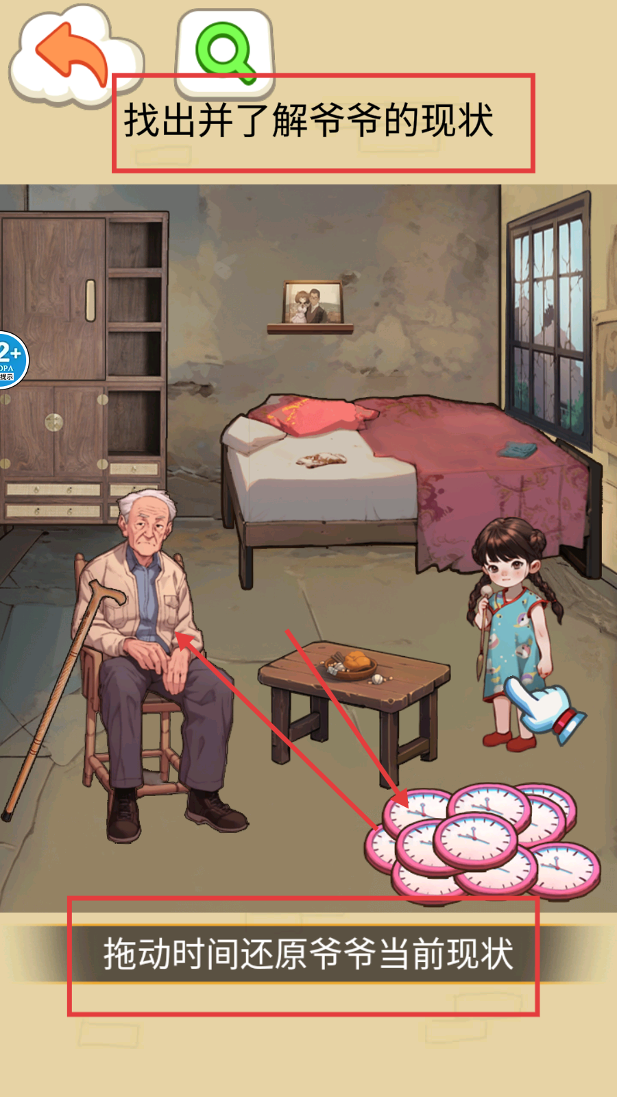 3、在游戏场景中,根据提示【找出并了解爷爷的现状】,拖动时间相关元素,还原爷爷的当前状况。