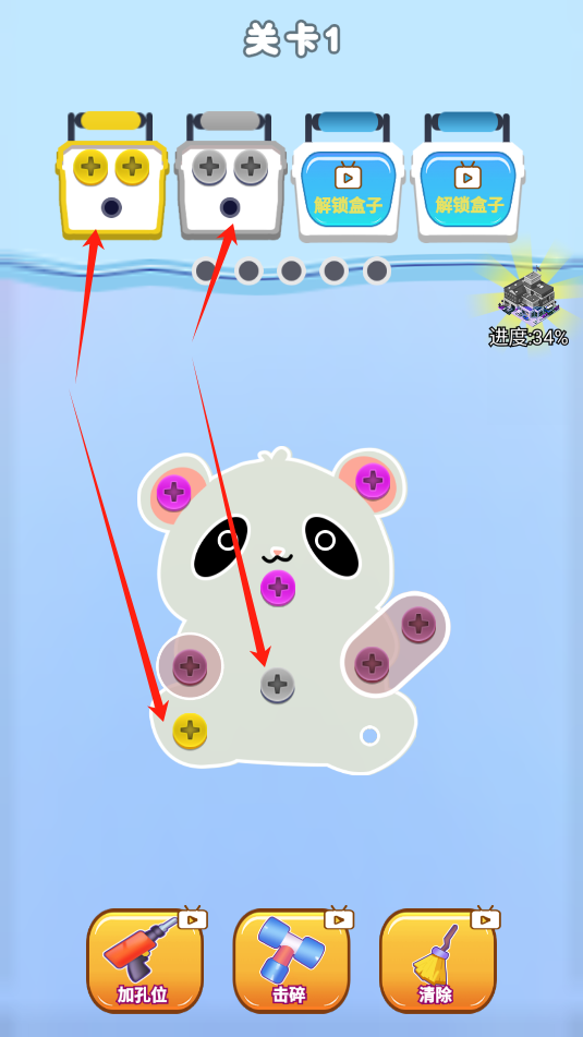 1、进入游戏,根据上方盒子的颜色,点击同颜色的螺丝,放置三个螺丝即可消除。