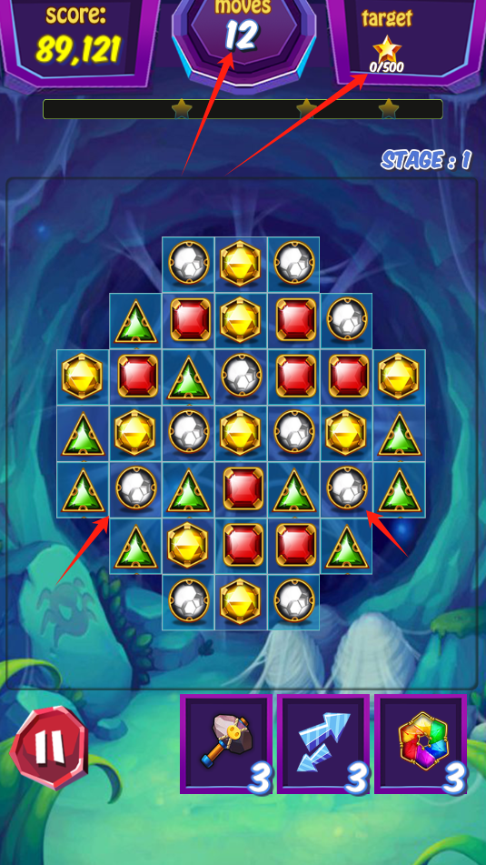 3、游戏需12步数内,完成500分数,点击滑动使三个相同的宝石在同一行或一列来消除获得分数。