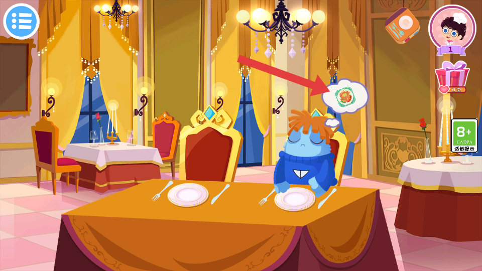 2、顾客入座后,点击红箭头指向的【食物】气泡,确定要制作的菜品。