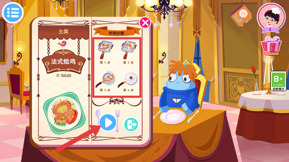 3、出现菜品制作界面后,查看【法式烩鸡】菜品的【料理步骤】,点击【→】播放按钮开始制作。