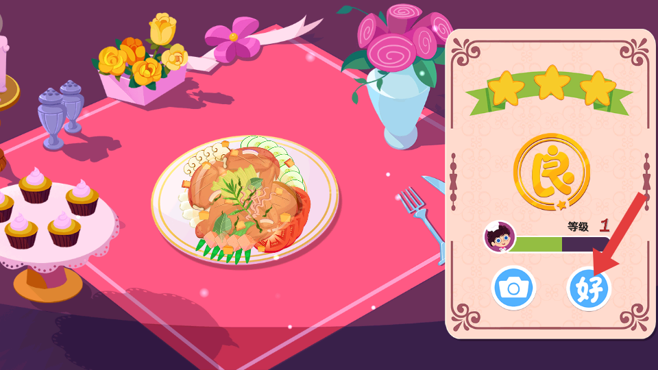 4、完成菜品制作并上菜后,依据顾客给出的【★★★】等评价,点击【好】按钮,继续服务下一位顾客或开启新任务。