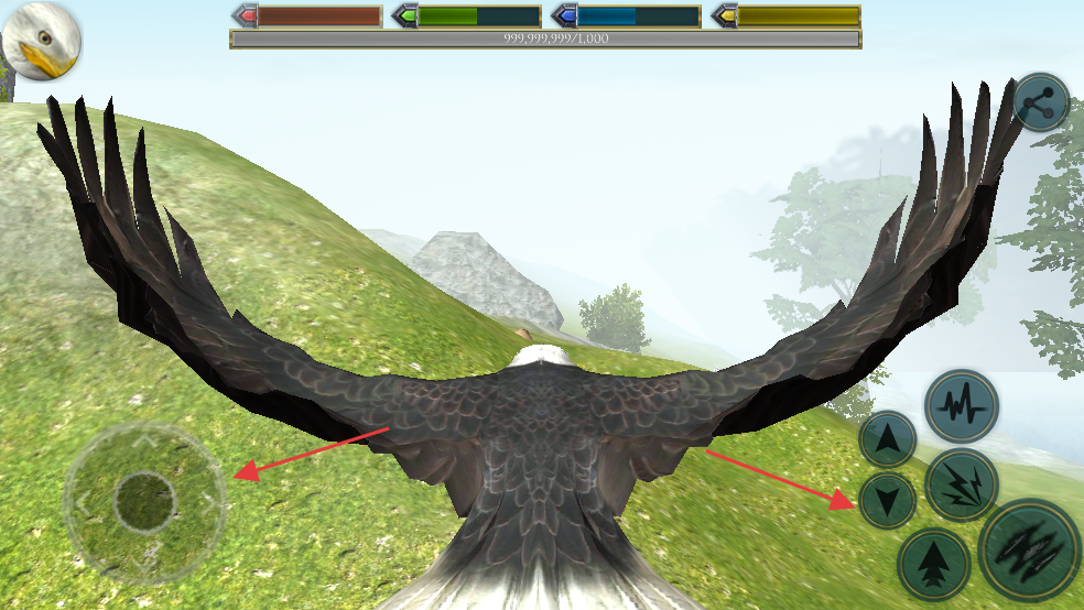 1、操控老鹰在山野间飞行,利用左侧虚拟摇杆调整飞行方向,右侧功能按钮控制飞行姿态,在青山绿树间穿梭。
