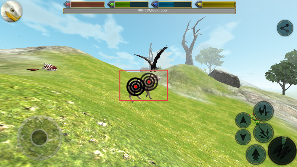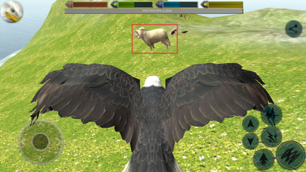2、发现草地上的羊,调整老鹰飞行轨迹,向羊靠近,准备进行捕猎行动,紧盯目标,把握好攻击时机。