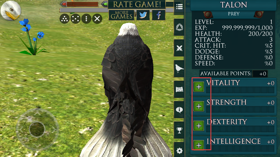 4、捕猎结束后,进入老鹰属性界面,可看到活力、力量、敏捷、智力等属性栏,根据需求点击“+”号为老鹰分配属性点。